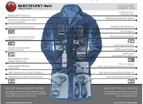 Pero todo tiene un límite y nuestras chaquetas también. ¿Cuánto es posible guardar en tres o cuatro bolsillos? Para desafiar los imposibles la marca Scottvest desarrolló una chaqueta con 20 bolsillos que permite guardarlo todo. Su nombre es Wilson Travel Vest y en él incluso es posible guardar calzado y ropa además de los documentos y gadgets.