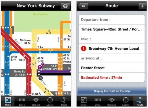Una aplicación muy interesante es New York Subway, un servicio disponible para el iPhone que te permitirá saber cuales son las estaciones de metro más cercanas al lugar donde te encuentras. Por supuesto, la presencia de un GPS es vital para el funcionamiento de este servicio pues junto a la cámara del teléfono permitirá conocer las estaciones que se encuentran a menos de 1 km de distancia.
