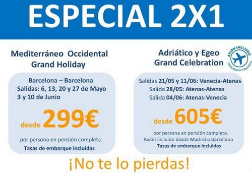 Los buques del 2×1 son el Gran Celebration y el Grand Holiday y las fechas de salida están entre el 6 de mayo y el 11 de junio. El primero es el que zarpa de Atenas o Venecia y el segundo es que parte de Barcelona.